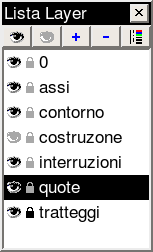 Nella Figura 14 il livello corrente è il livello “quote”. L'icona a forma di occhio alla sinistra di ogni nome indica se il livello è visibile o nascosto (congelato). Nella figura, il livello “costruzione” è congelato, tutti gli altri livelli sono visibili. Potete mostrare o nascondere velocemente un livello facendo click sull'icona a forma di occhio.