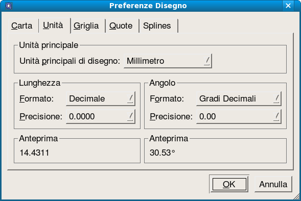 Le unità e i relativi formati scelti per le lunghezze e gli angoli sono utilizzati per la visualizzazione delle coordinate nella barra di stato così come per il formato delle etichette delle quote e per scalare correttamente oggetti inseriti dalle librerie. Consultare il capitolo “Unità di disegno” per una panoramica dettagliata su tutte le unità e i formati disponibili (Figura 69).