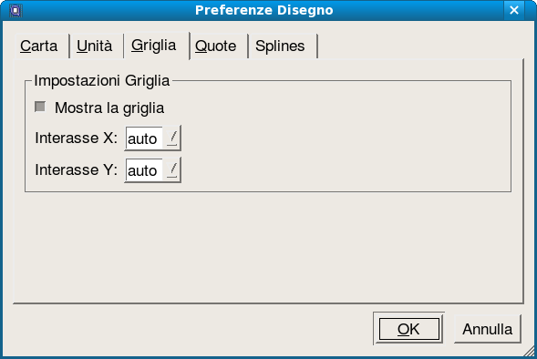 In questa sezione della finestra di dialogo delle preferenze di disegno è possibile regolare la spaziatura della griglia e la sua visibilità (Figura 70). La spaziatura predefinita è “auto”, impostazione che consente che la griglia scali automaticamente a una spaziatura ragionevole in relazione al fattore di scala corrente del disegno.