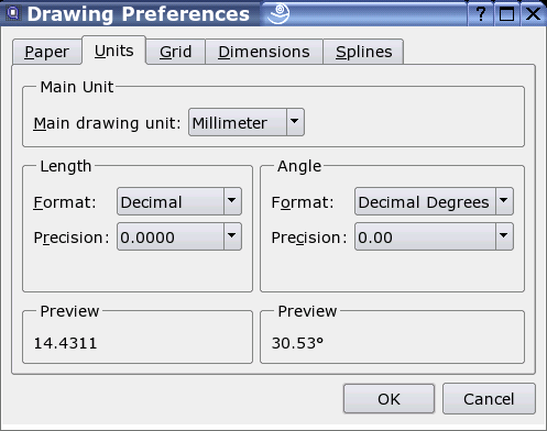 长度和角的测量单位和格式可以在每个图样中单独配置. 默认状态行的尺寸和标注的标签已经设定格式. 此外对于从部件库里插入的部件的正确 比垒,被选的长度单位非常重要. 对于可用单位和格式的总览,参见附录 - 测量单位(图 67).