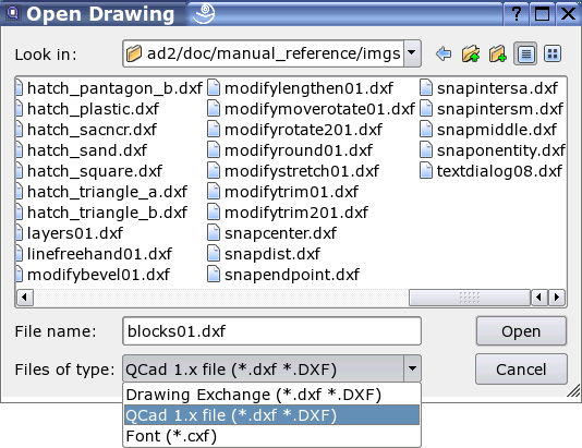 当用 QCad 2 打开 QCad 1 的图样时,会遇到标注,填充和文字的表现问题. 这是由于 QCad 1 以 DXF 格式保存的图样与 QCad 2 的 DXF 格式不 兼容. 要导入 QCad 的 DXF 图样,请在打开文件对话框里如图 149 所示设为"QCad 1.x file (*.dxf *.DXF)".