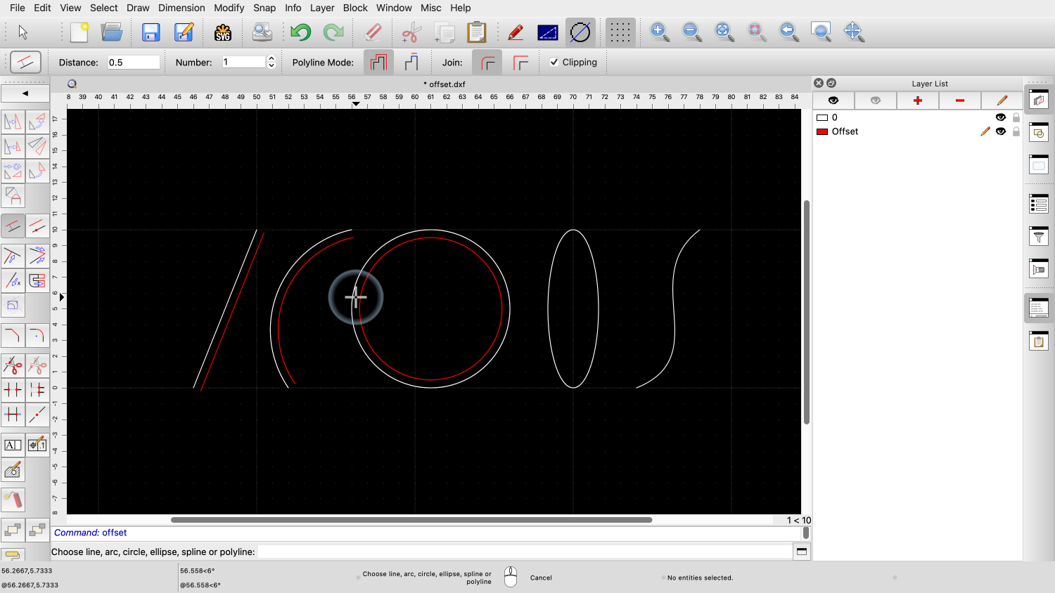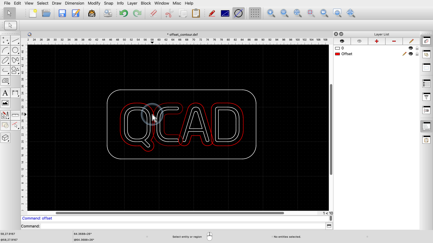 If we click a polyline or a chain of connected entities, QCAD automatically offsets the whole contour.