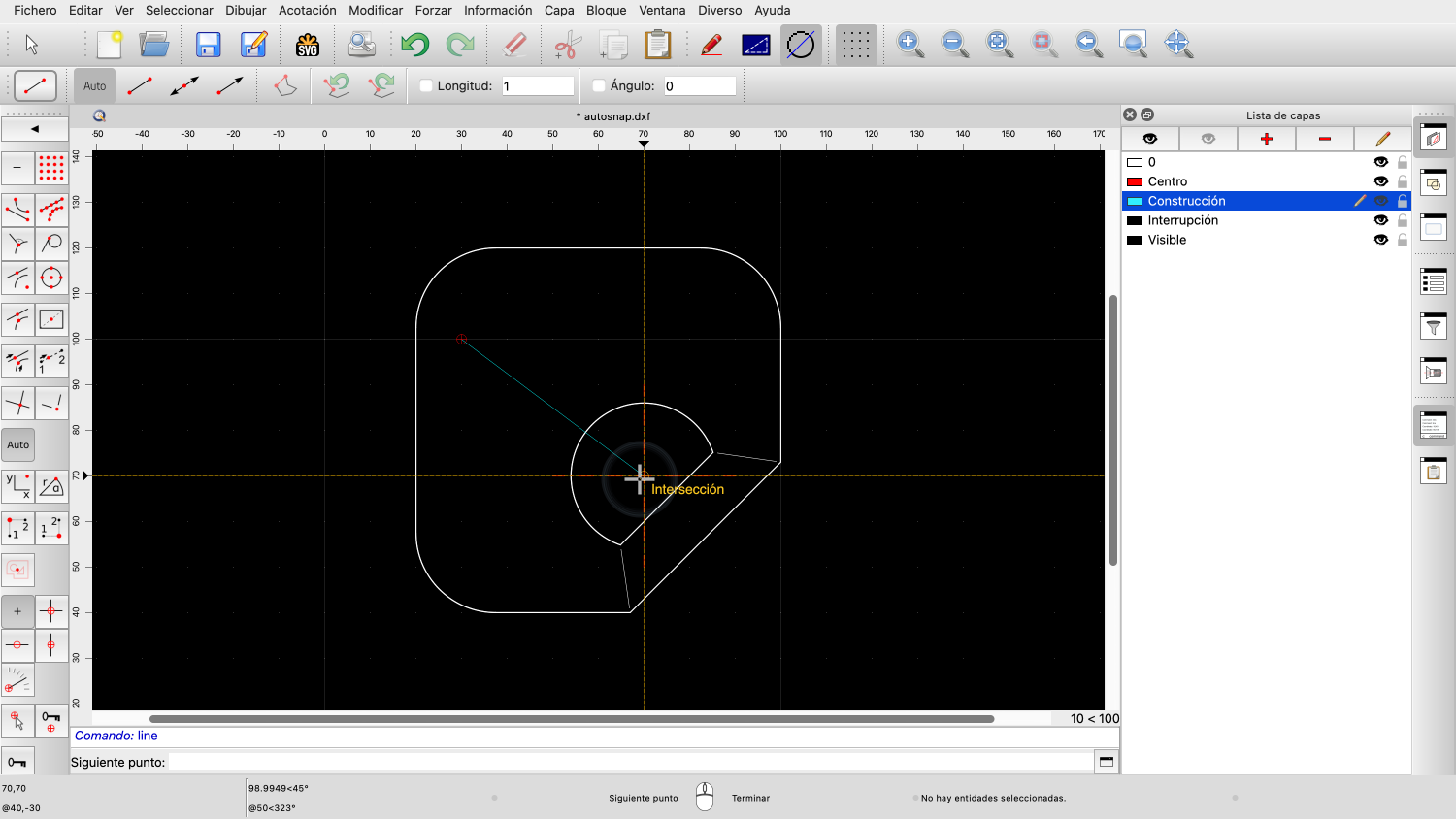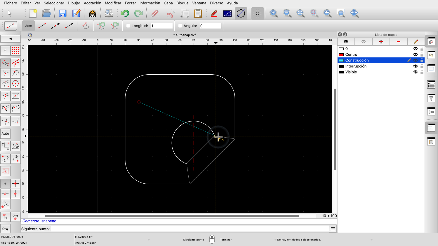 QCAD calcula automáticamente el punto de intersección más cercano y nos indica que está forzando a una intersección.