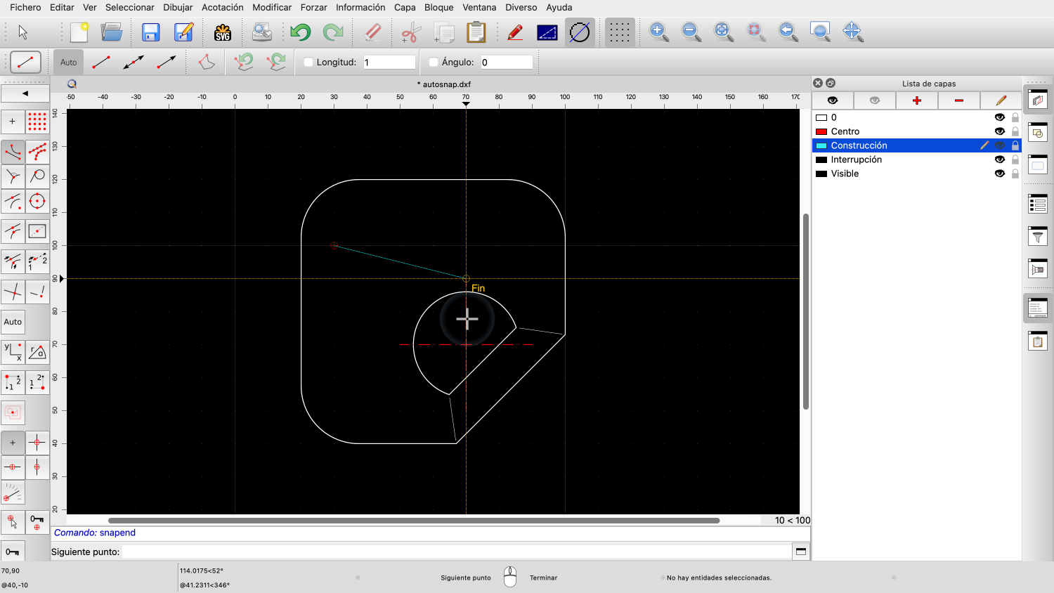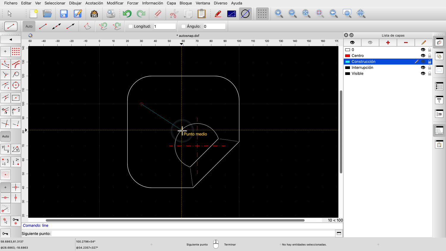 Por ejemplo, si acercamos el ratón a la intersección de las dos líneas rojas centrales, QCAD forzará automáticamente el punto de intersección de las dos líneas.