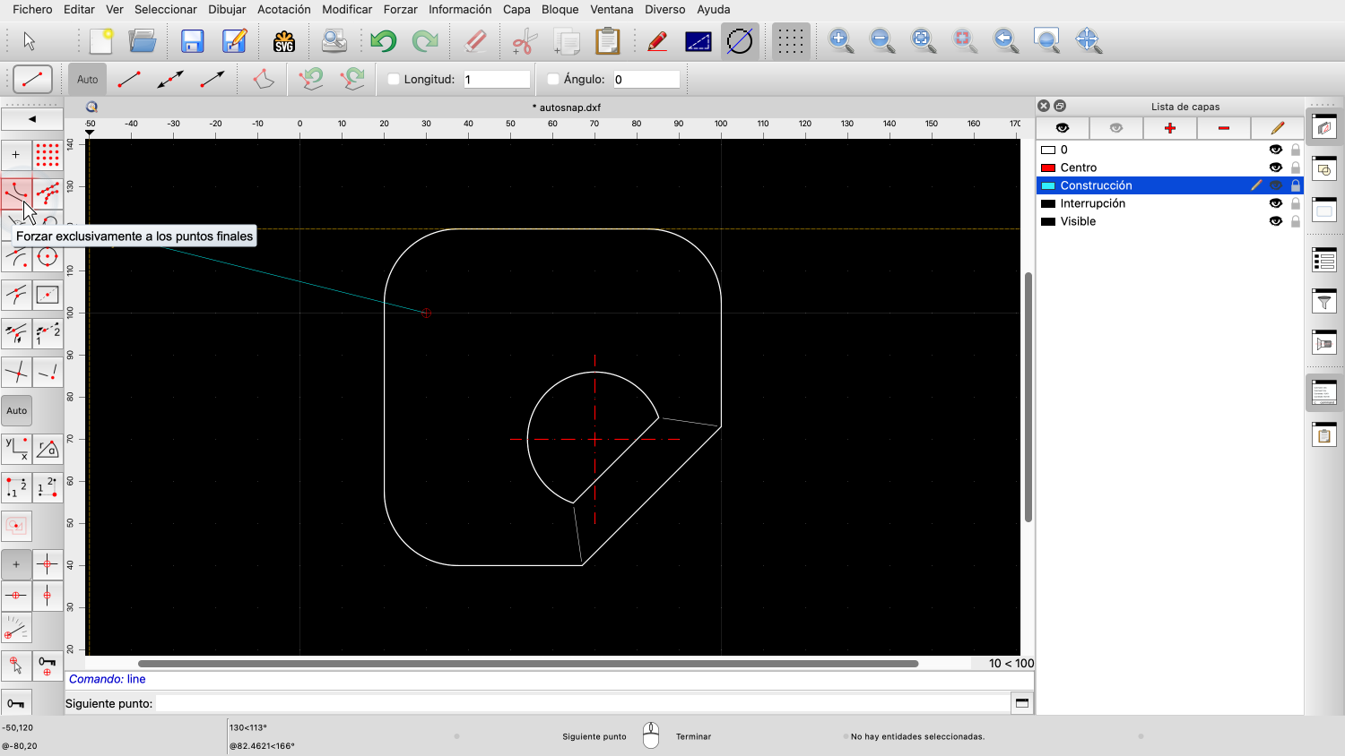 También podemos decirle a QCAD que sólo se forze a determinados tipos de puntos, por ejemplo, sólo a los puntos extremos.