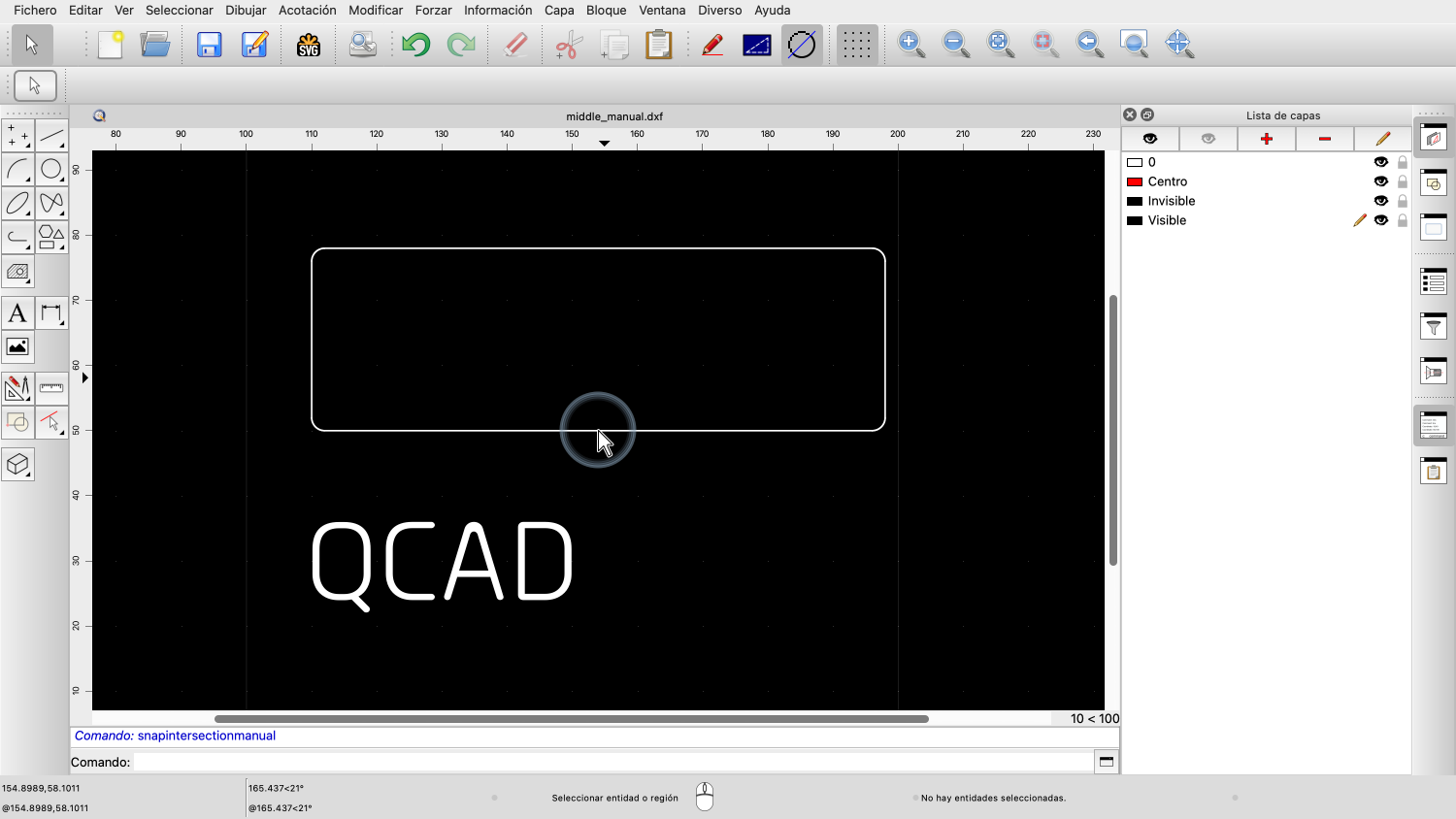 Tenga en cuenta que no tenemos que situar el cursor del ratón exactamente en el punto de intersección, sólo lo suficientemente cerca para que QCAD sepa que queremos utilizar ese punto.