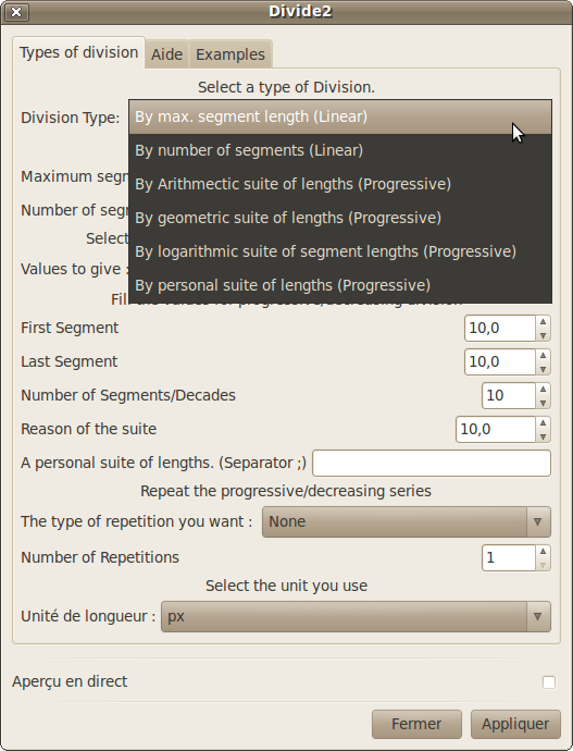 Je voudrais pouvoir spécifier un nombre d'éléments à disposer sur un tracé et imposer une progression (arithmétique, géométrique, logarithmique) positive ou négative. Le système calculera lui-même les meilleures distances pour compléter la série.