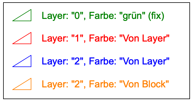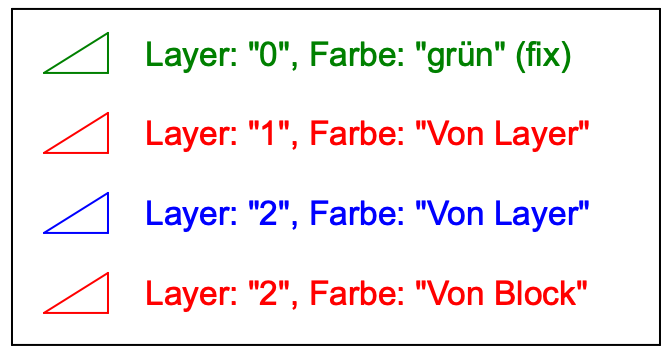 Wenn wir die Blockreferenz auf einen anderen Layer verschieben oder die Farbe der Blockreferenz auf eine feste Farbe einstellen (anstelle von "Von Layer"), ändern die Objekte mit Farbattribut "Von Block" ihre Farbe entsprechend.