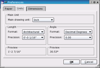 19 Nastavení výkresuToto nastavená se týká pouze aktuálního výkresu. Používá se pro nastavení kreslících jednotek, velikosti papíru, nastavení vlastností kótování, atd ... Úpravy - Nastavení aktuálního výkresu PapírNastavení papíru má vliv pouze při tisku výkresu. Formát papíru a jeho orientace kterou vyberete v tomto dialogovém okně bude použita při náhledu před tiskem (obrázek 68). Figure 68: Nastavení papíru pro aktuální výkres. JednotkyZvolené jednotky a formát délek a úhlů je použit pro souřadnice zobrazené ve stavovém řádku, popisky kót a také pro vkládání dílů z knihovny ve správném měřítku. Detailní přehled dostupných jednotek a formátů viz Dodatek - Kreslící jednotky (obrázek 69). Figure 69: Jednotky a jejich formát. KótyV této záložce můžete změnit rozměry kótovacího textu, velikost šipek a daší rozměry použité pro kóty (obrázek 70). Figure 70: Vlastnosti kót.