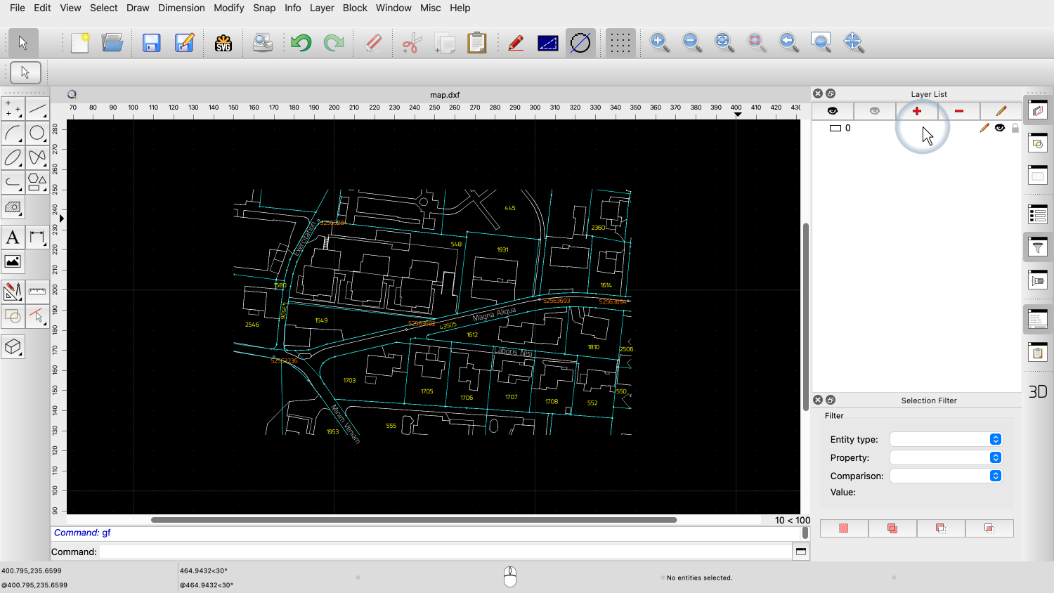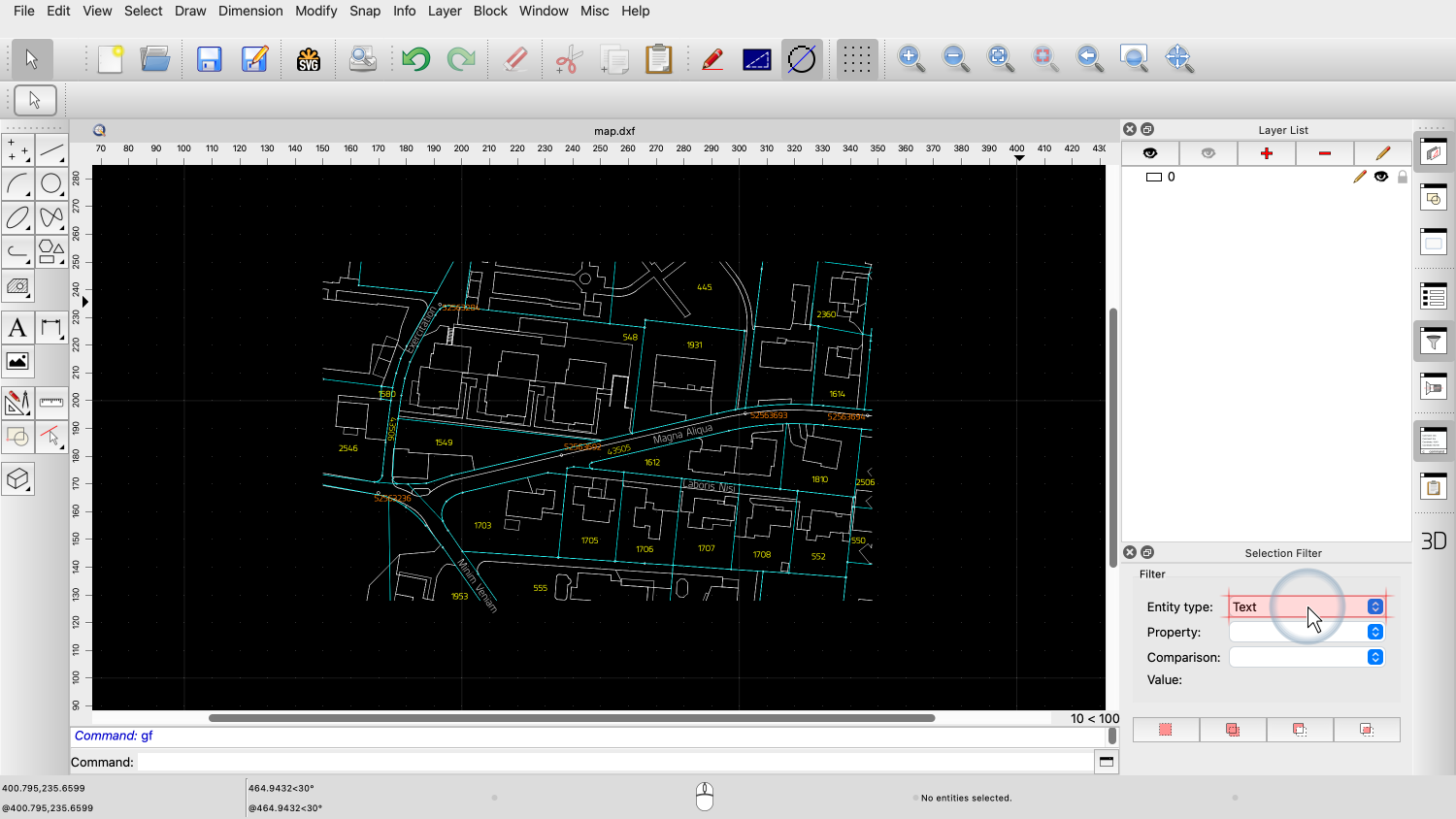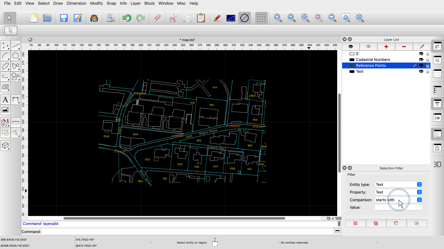 move them to a dedicated layer called "Cadastral Numbers". For this, we need to filter the text entities