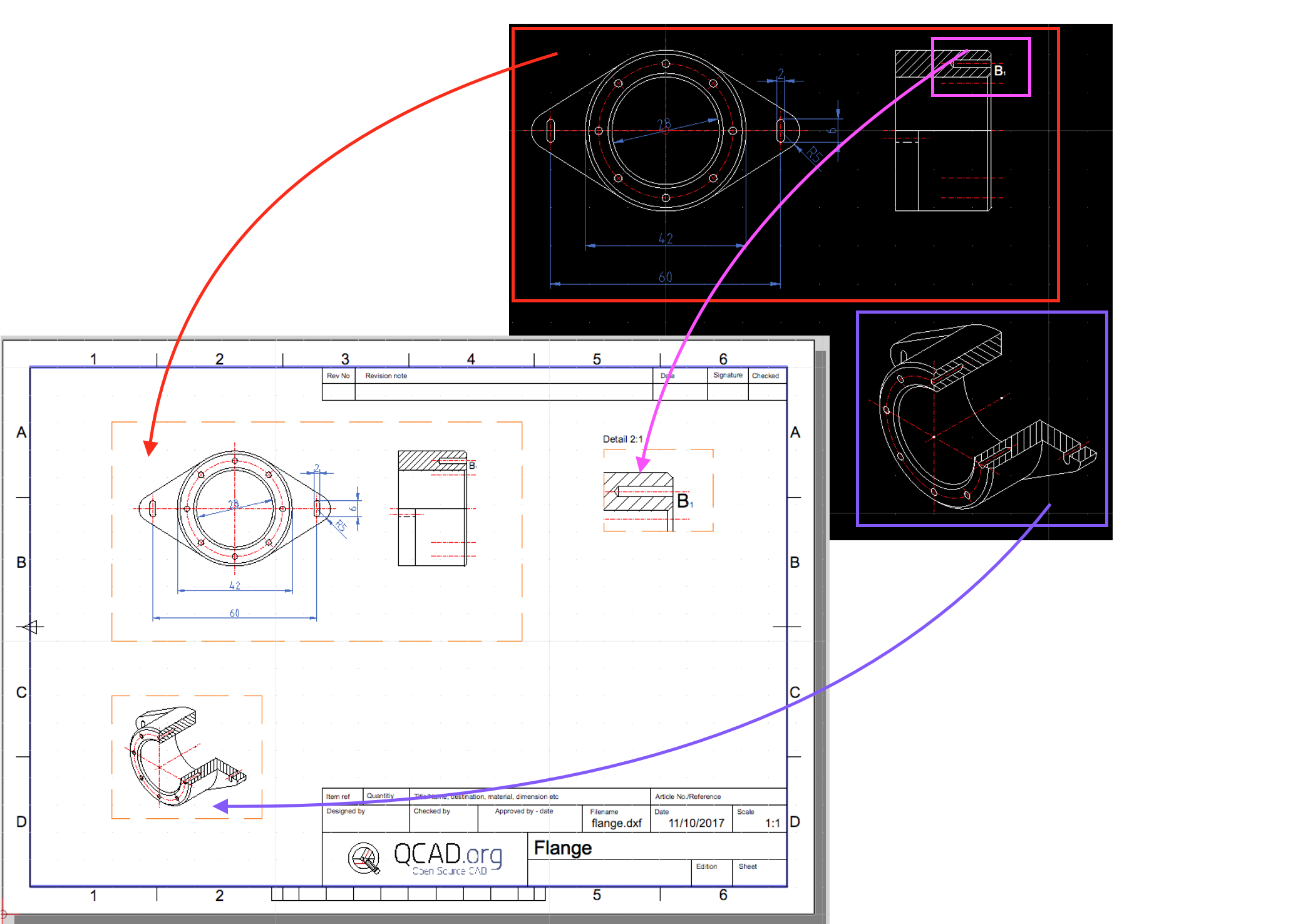 Consider the example "flange.dxf" which comes with every installation of QCAD. When you open the drawing in QCAD, you can see the model space where all the geometry is created in real size. The geometry is typically arranged in any way that happened to be convenient for constructing it. It is usually not arranged in the way the drawing should be printed.