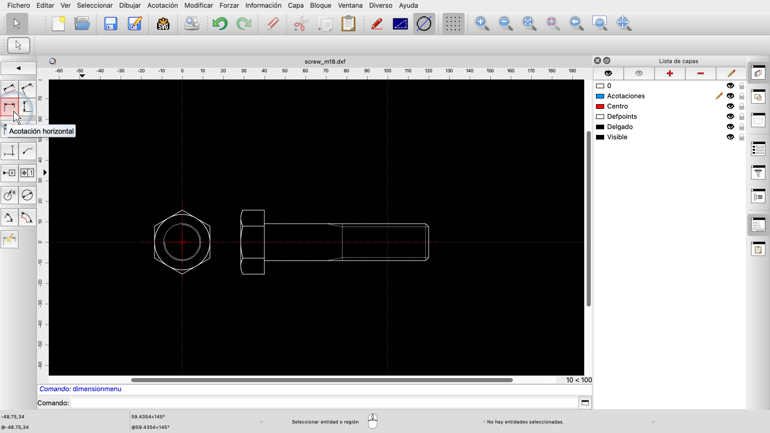 En este ejemplo, podemos acotar la longitud nominal del tornillo con una acotación horizontal.