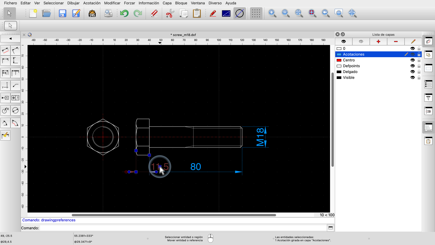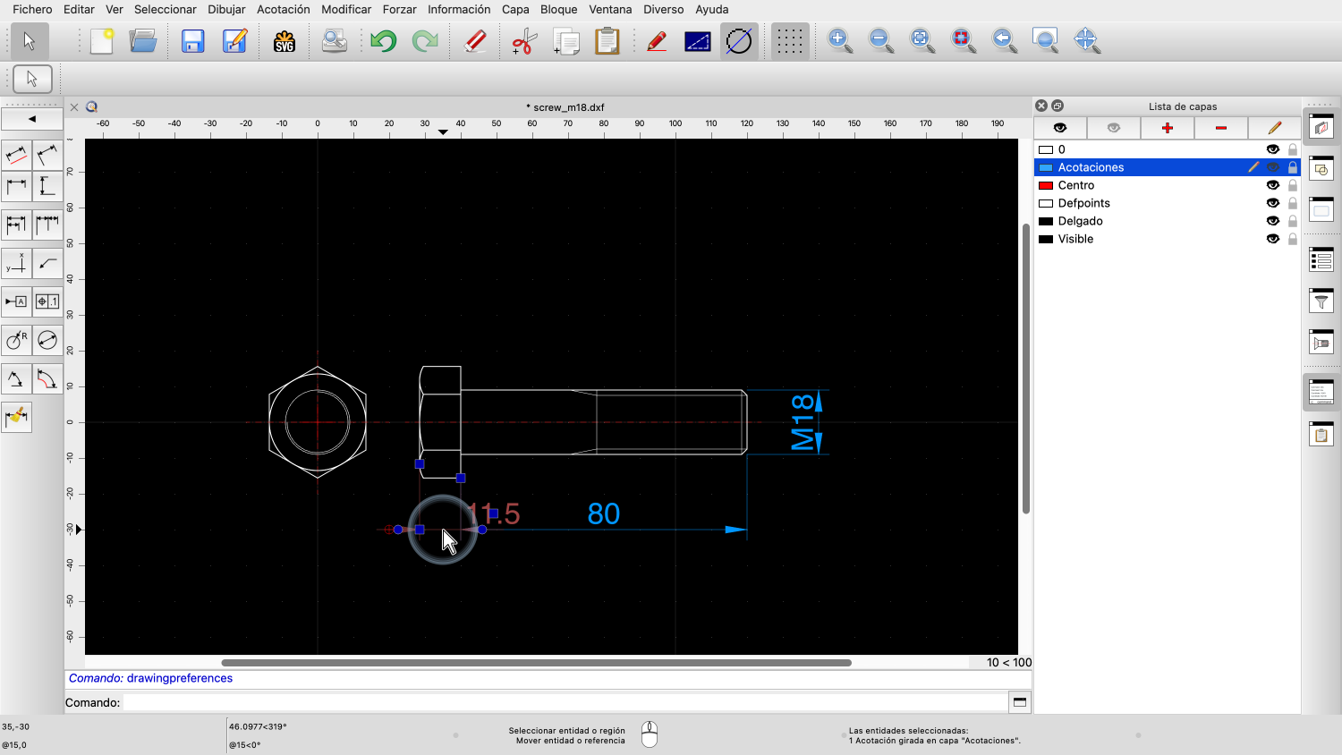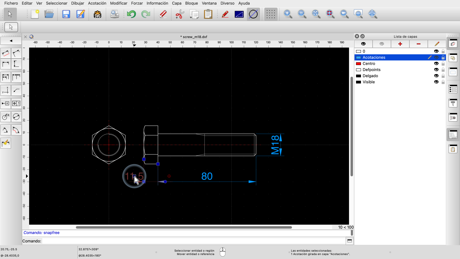 Antes de hacer clic en la posición de la línea de acotación, queremos añadir la letra M antes del número 18 para indicar que el tornillo tiene una rosca métrica.