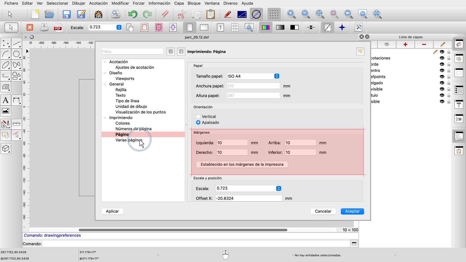 Antes de intentar ajustar la escala y la posición del dibujo, nos aseguramos de que la página está configurada como deseamos.