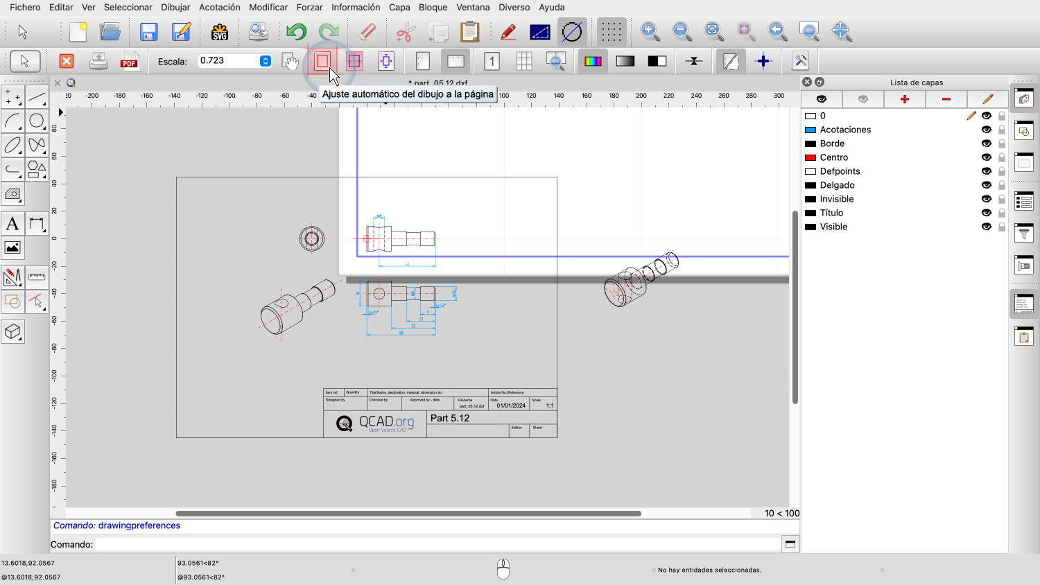 Autoajustar ajusta la escala y la posición del dibujo, para que todas las entidades quepan en la página con los márgenes que hayamos definido en la configuración de página.