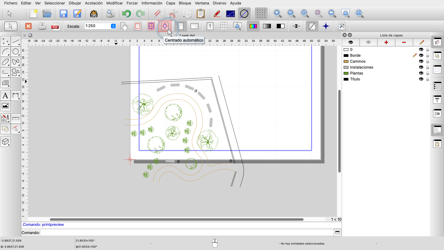 Para ajustar la posición del dibujo, utilizamos la herramienta para centrar automáticamente el dibujo en la página.