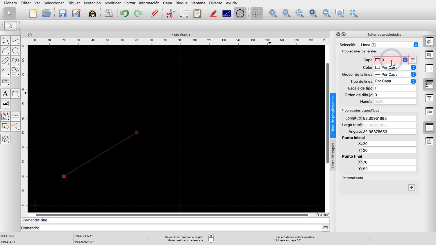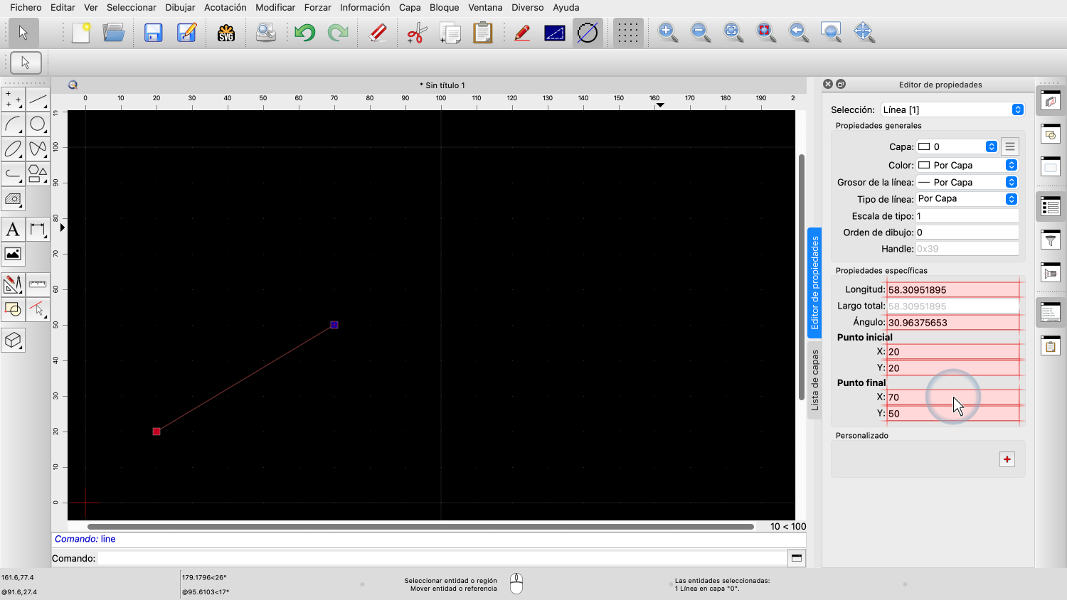 Para este ejemplo, dibujamos una línea y luego la seleccionamos, para poder ver sus propiedades.