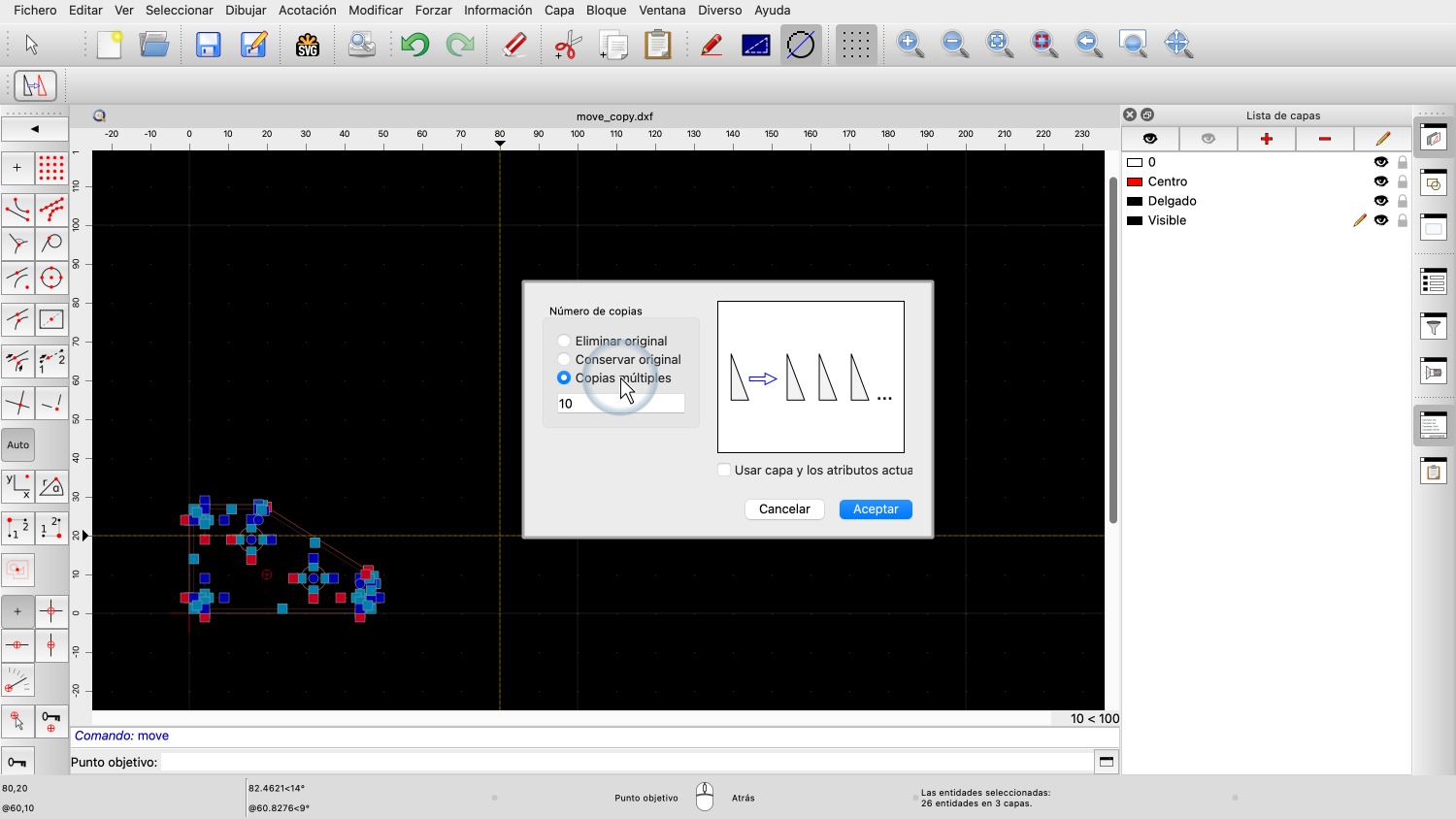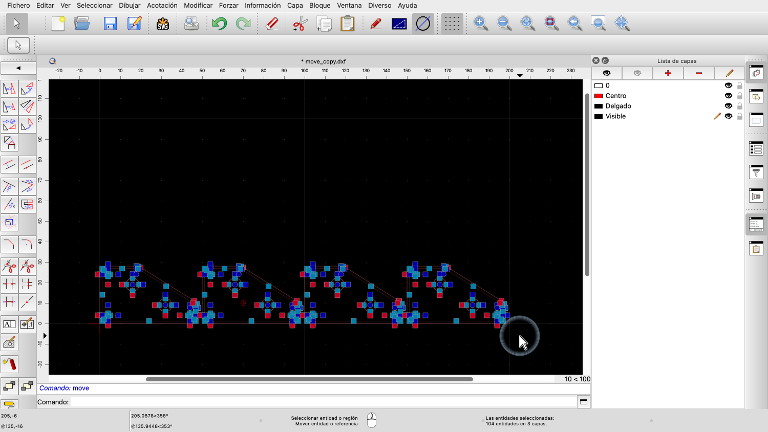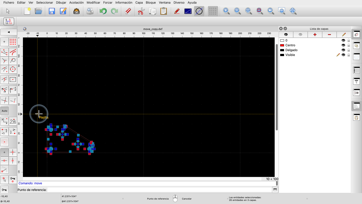 En este ejemplo, le decimos a QCAD qué entidades deben ser movidas o copiadas.