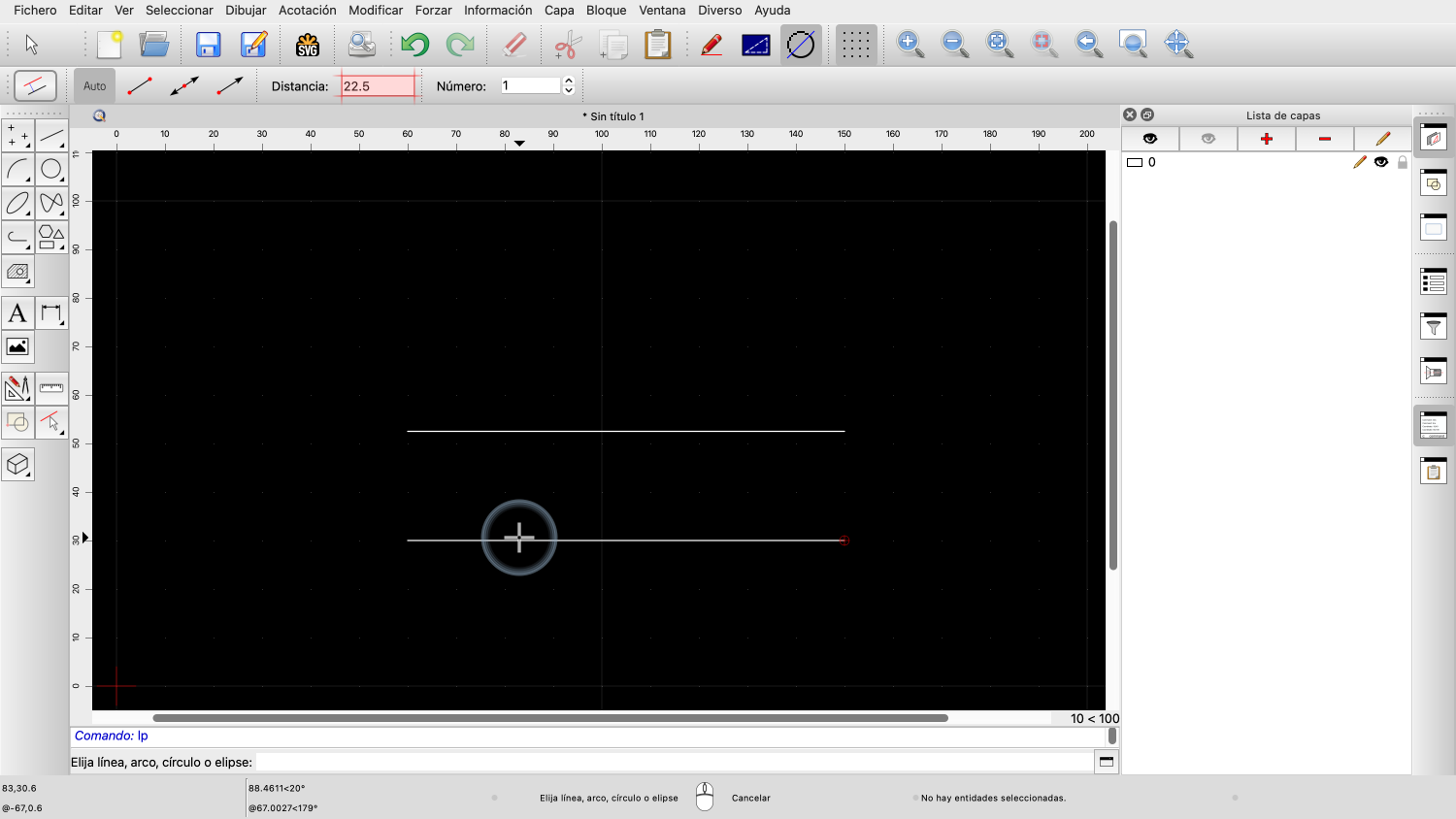 Queremos crear una línea paralela con una distancia de 22,5 unidades de dibujo.