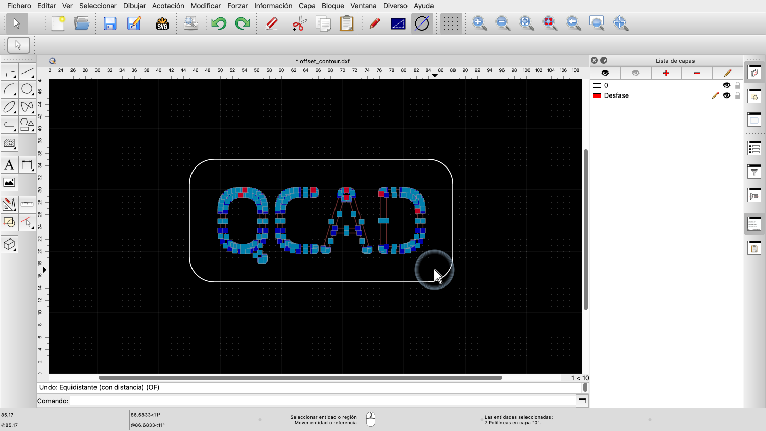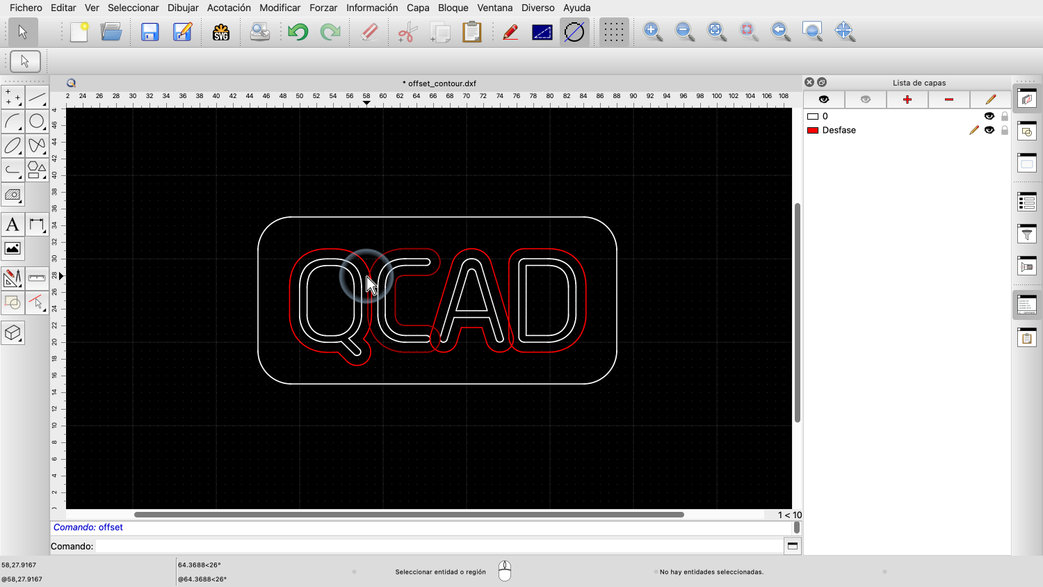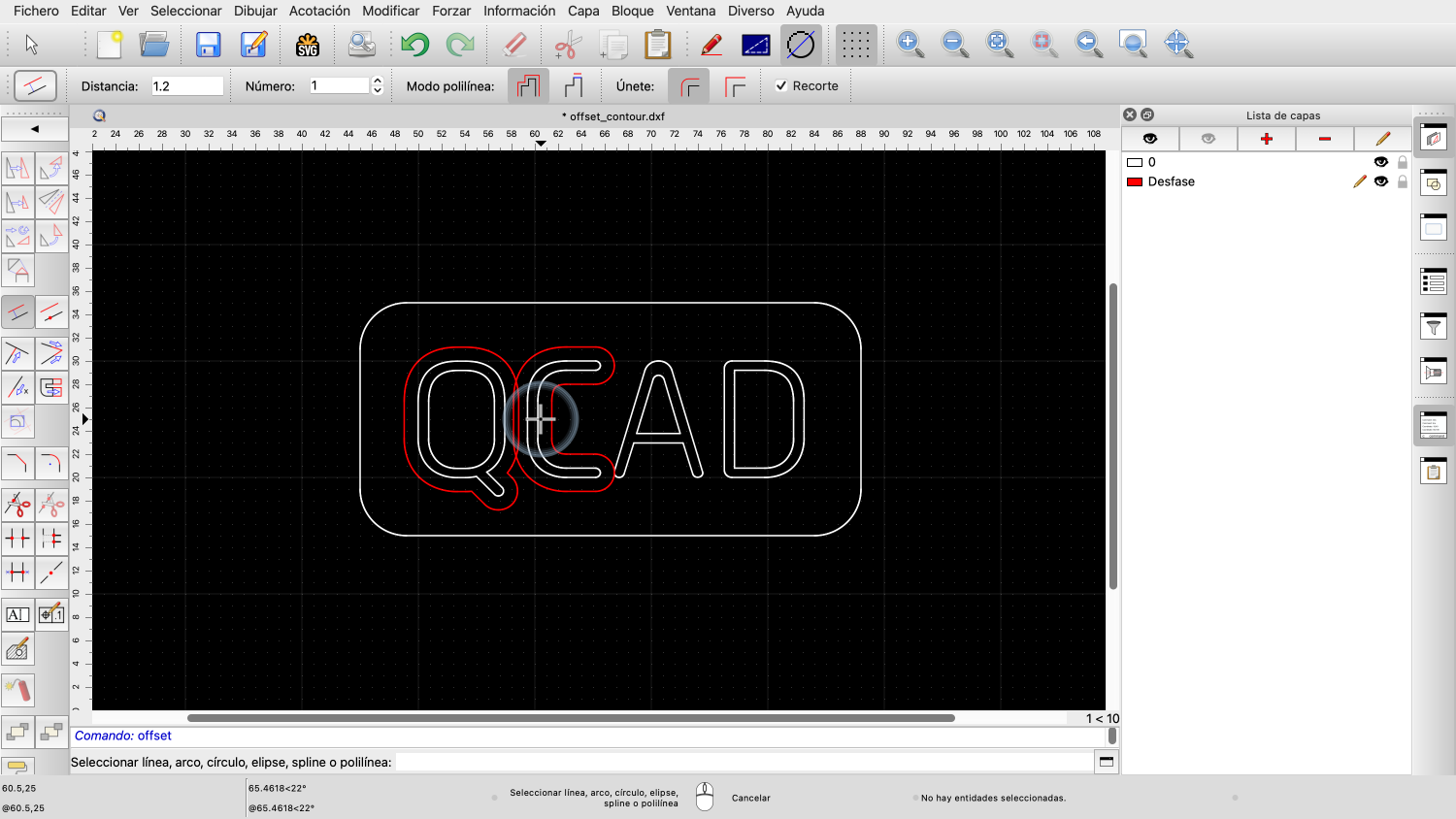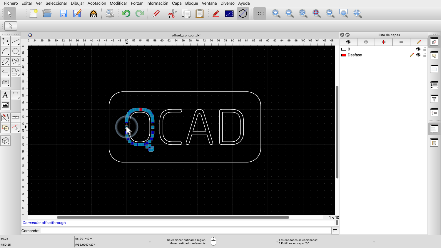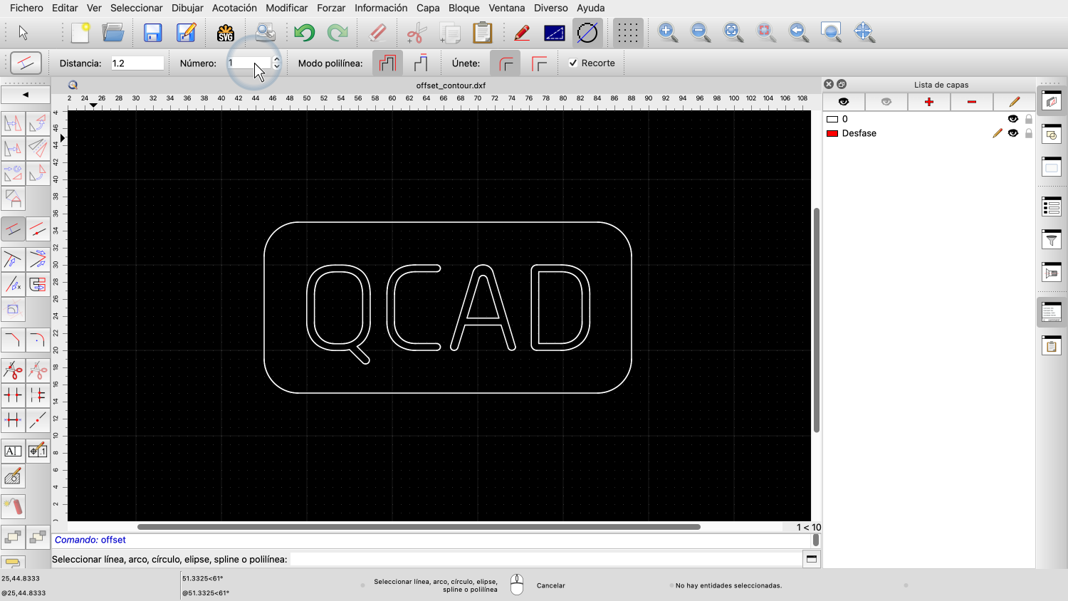 Si hacemos clic en una polilínea o en una cadena de entidades conectadas, QCAD desfasa automáticamente todo el contorno.