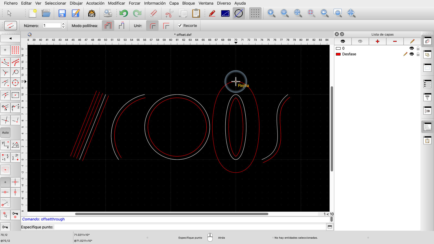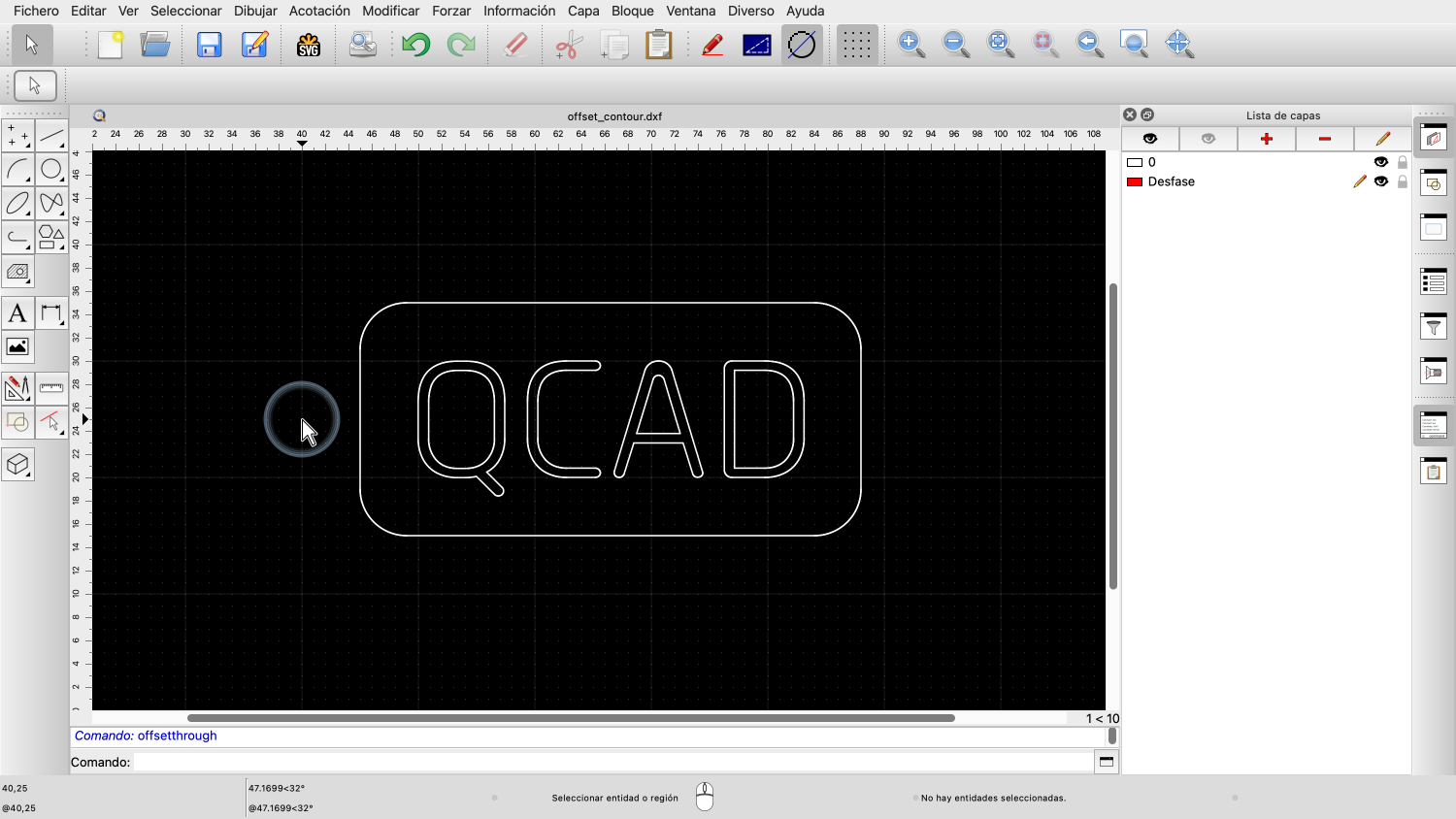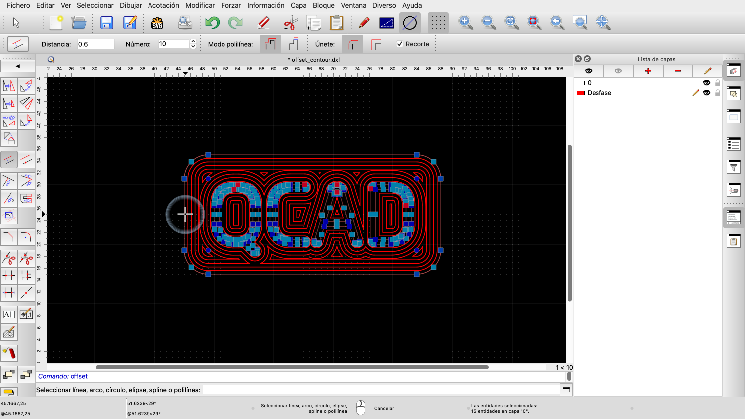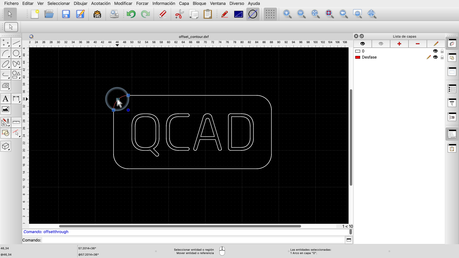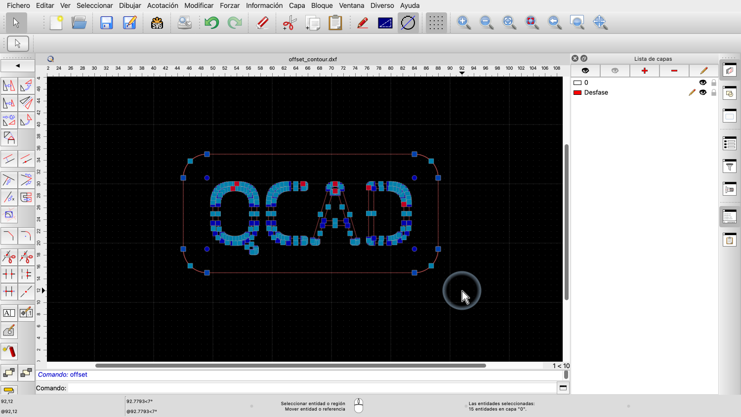 Si hacemos clic en una polilínea o en una cadena de entidades conectadas, QCAD desfasa automáticamente todo el contorno.