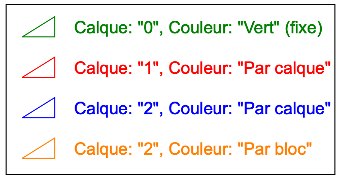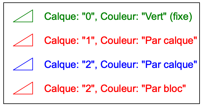 Si l'on déplace la référence du bloc vers un calque différent ou si l'on fixe la couleur de la référence du bloc à une couleur fixe (au lieu de "Par calque"), les objets dont l'attribut couleur est "Par bloc" changent leur couleur en conséquence.