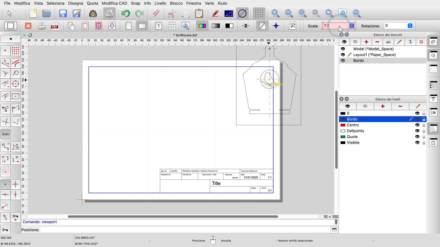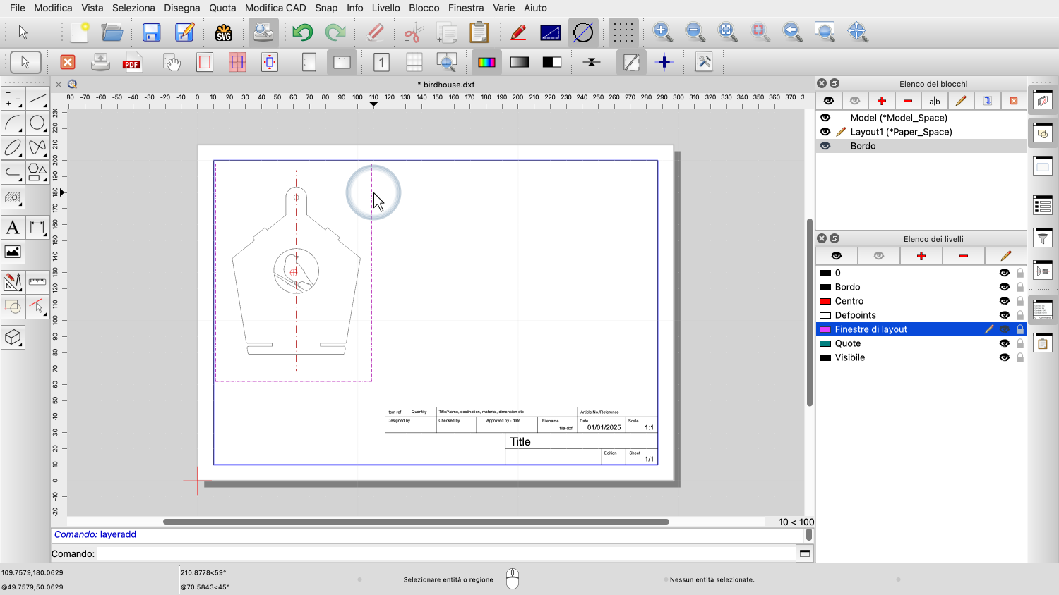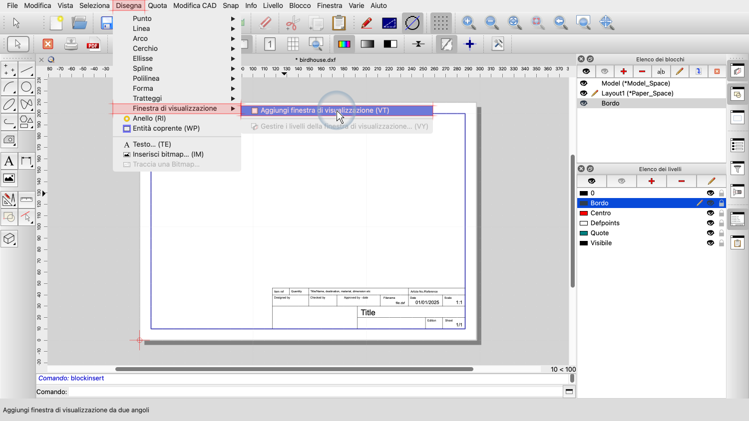 Vogliamo anche aggiungere un bordo e un blocco titolo del disegno con informazioni sul disegno.