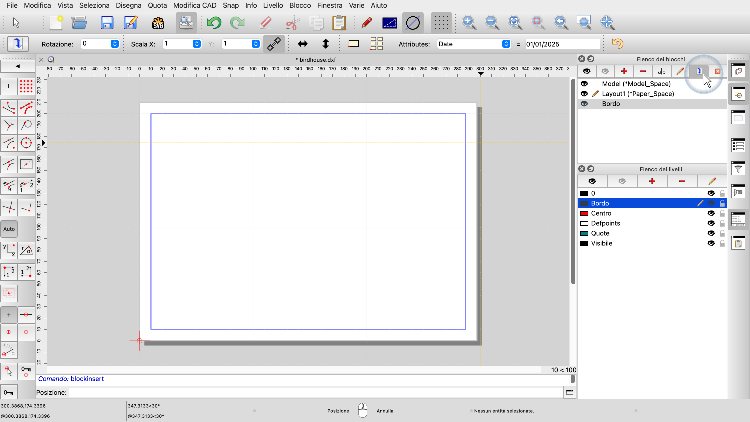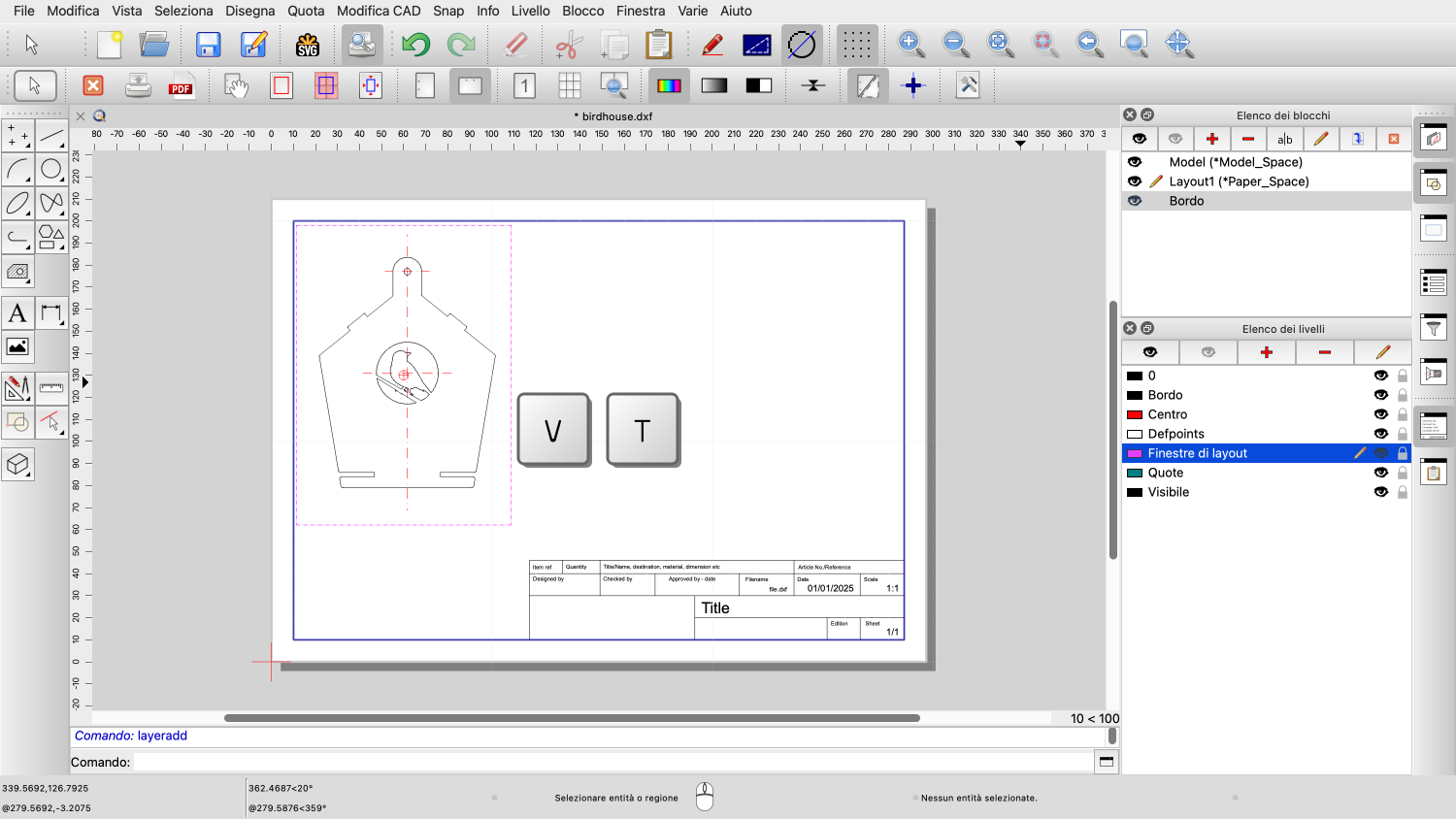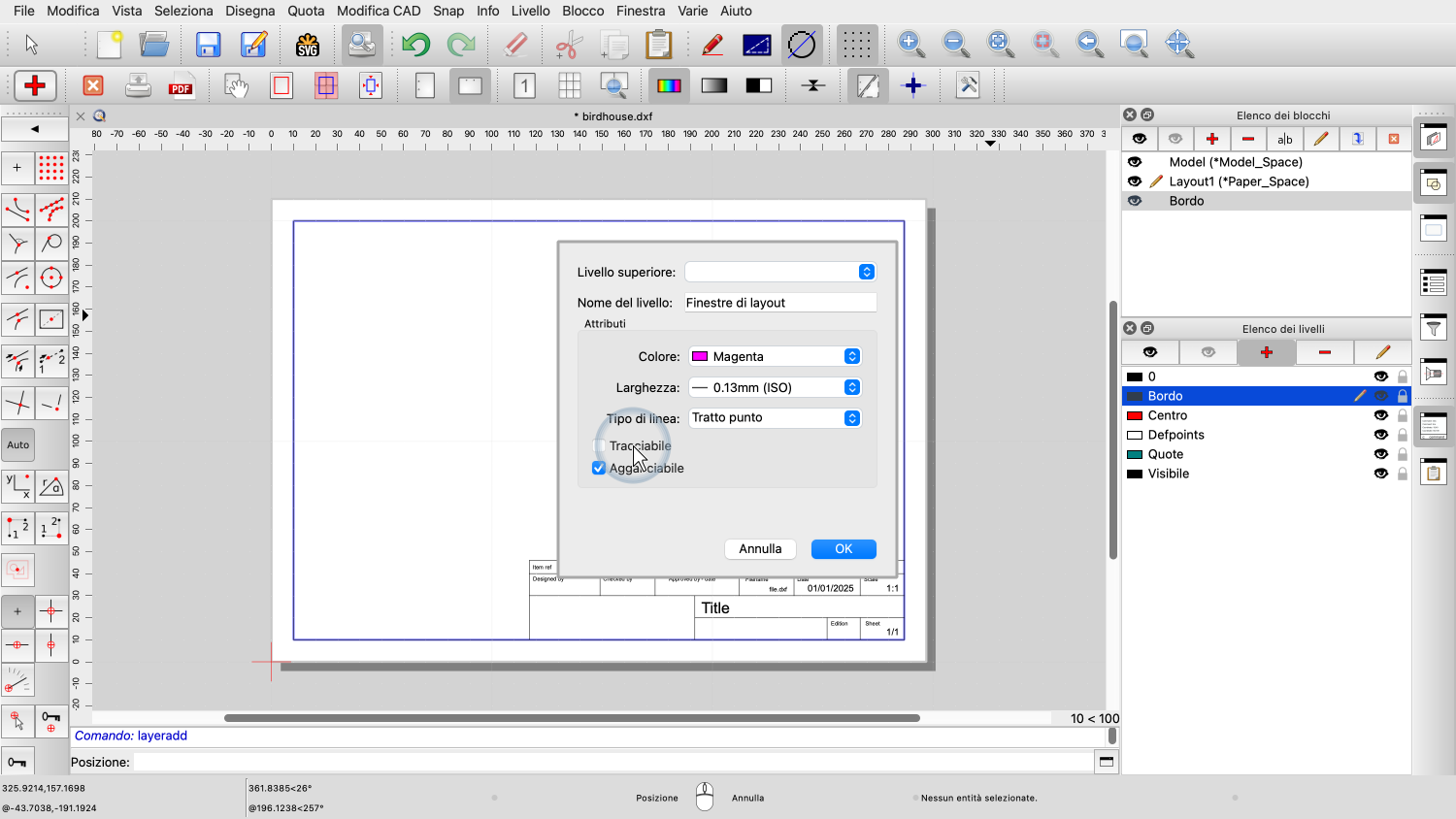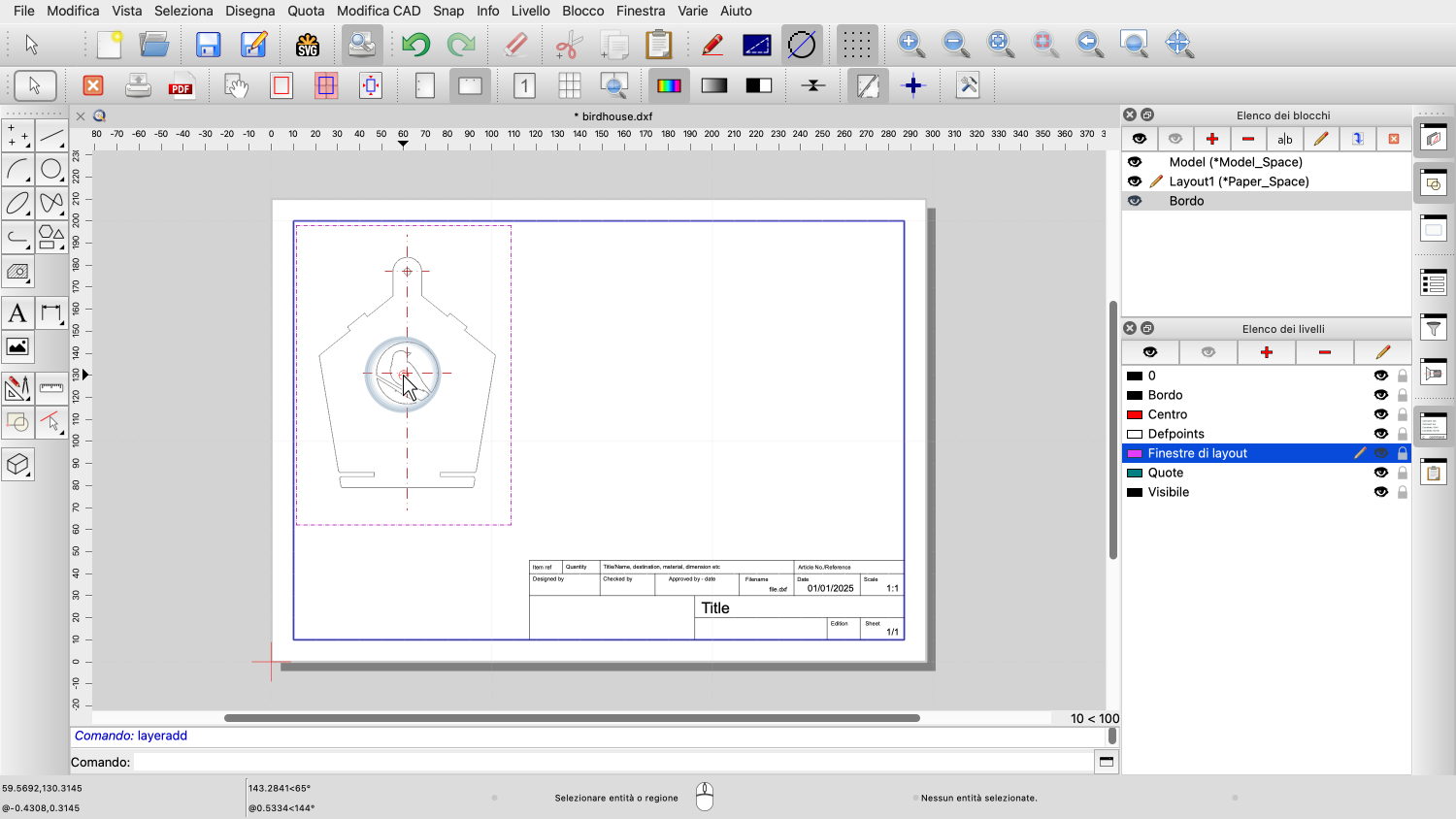 Vogliamo anche aggiungere un bordo e un blocco titolo del disegno con informazioni sul disegno.