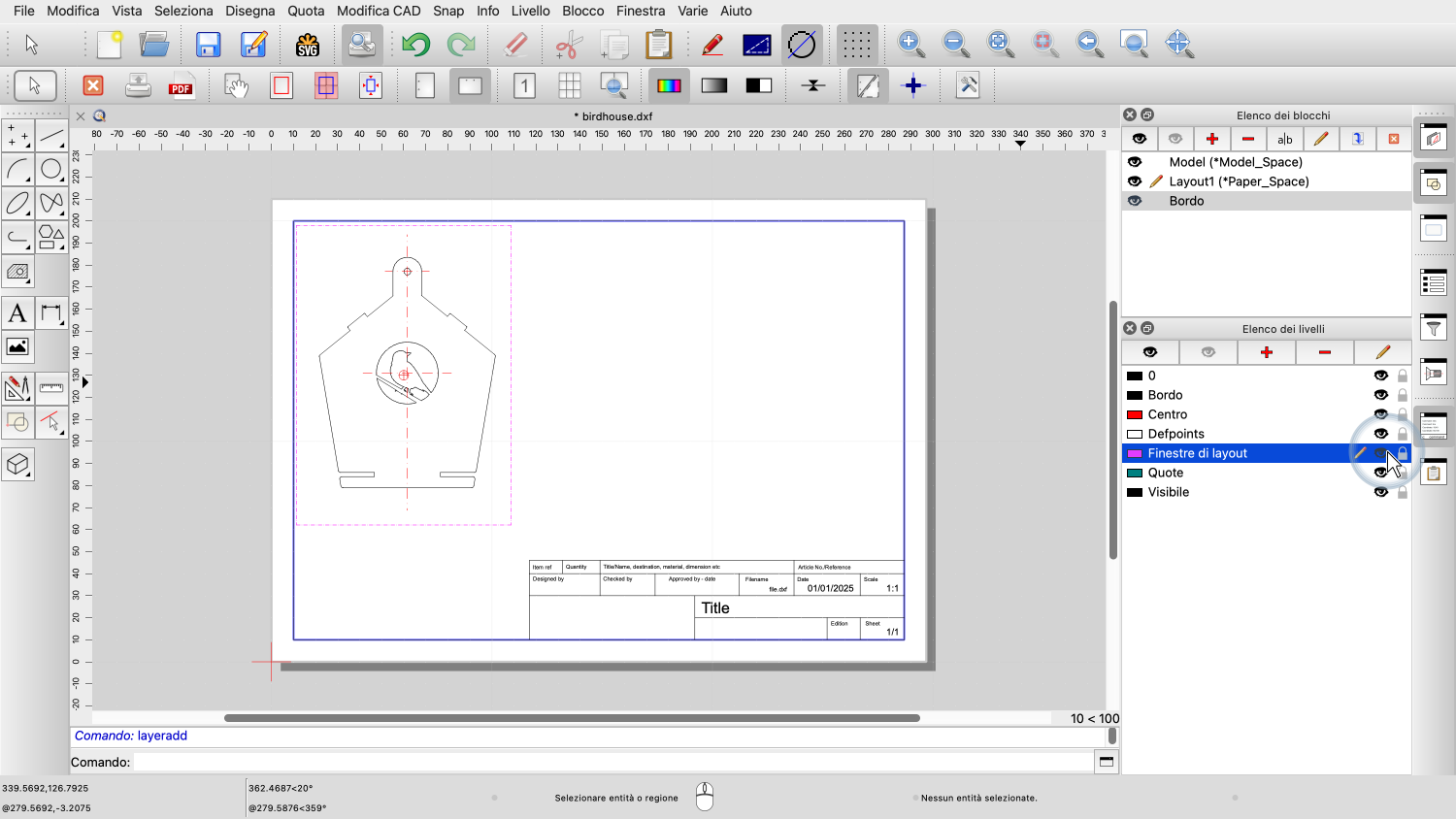 In QCAD, un layout rappresenta un foglio di carta dove si prepara il disegno per la stampa o l'esportazione in PDF.