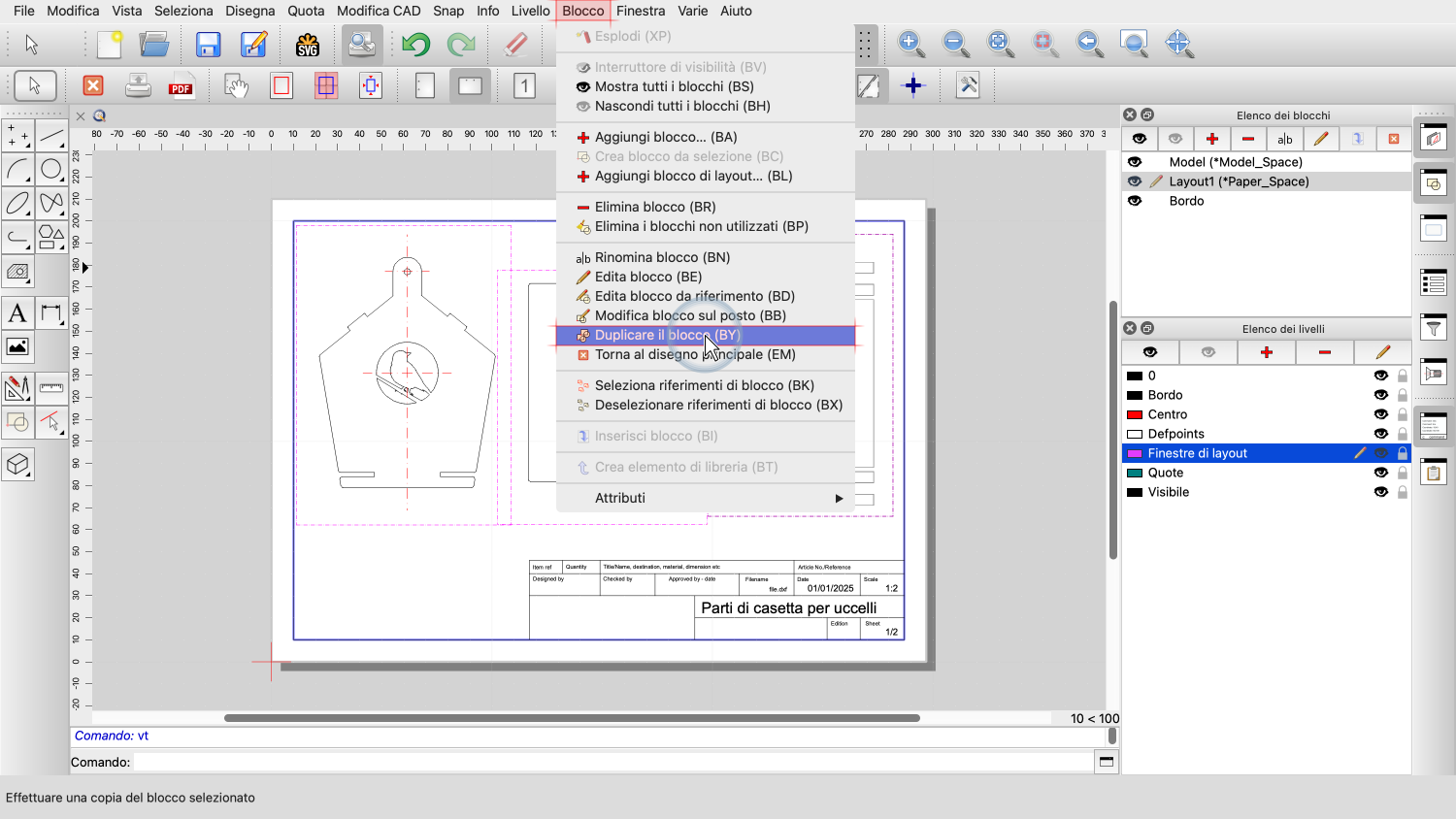 A seconda della versione di QCAD, possiamo anche vedere i blocchi di layout del disegno corrente come schede sotto l'area di disegno per comodità.