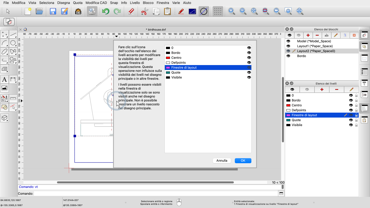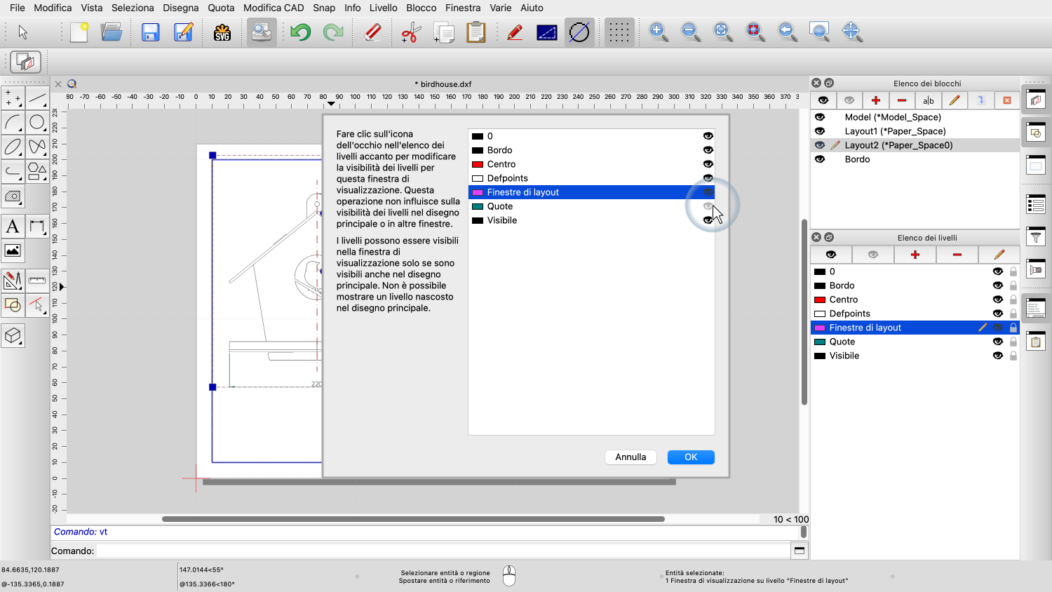 Per la finestra di layout a sinistra, vogliamo nascondere il livello delle quote.