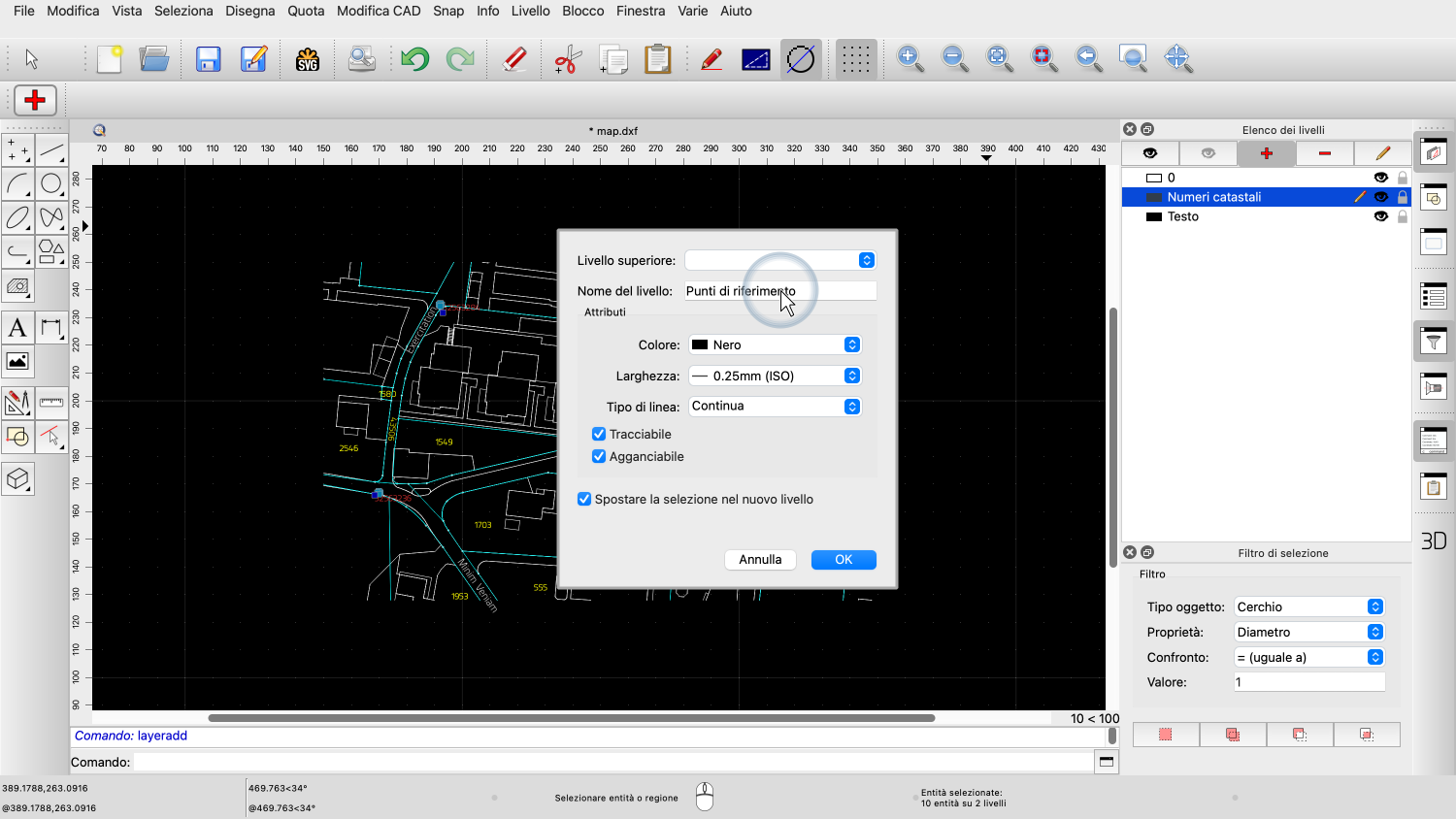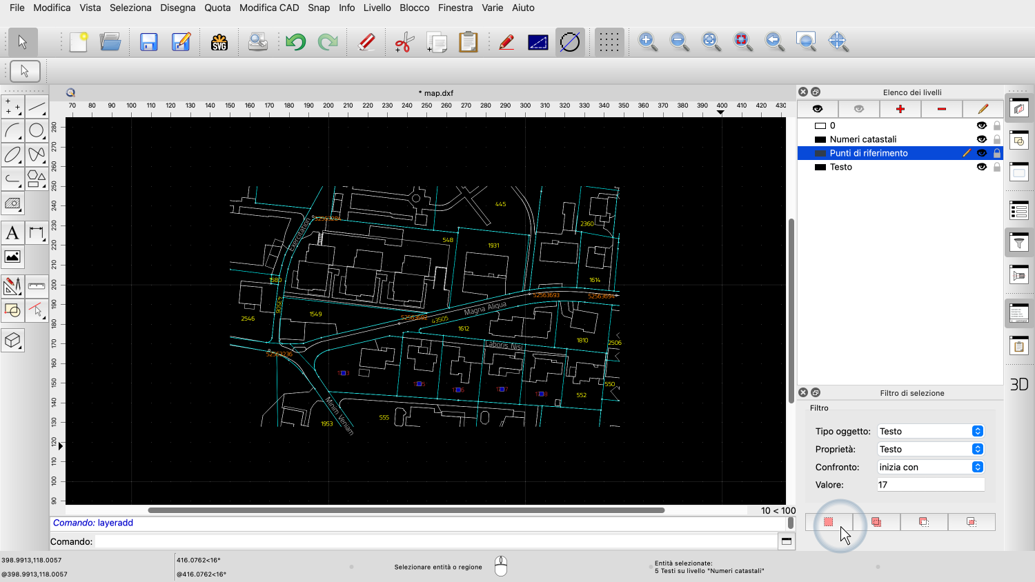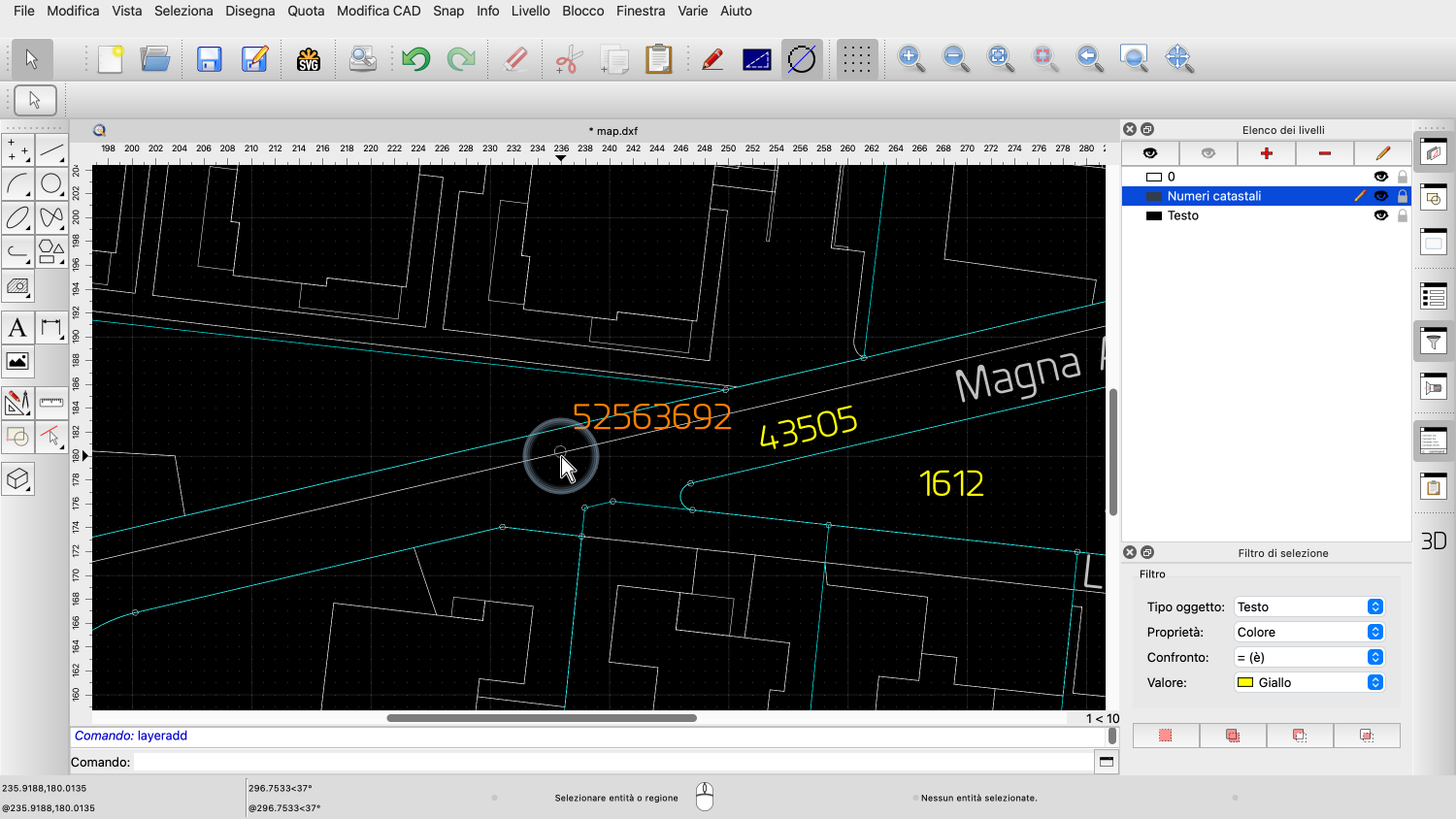 Selezioniamo tutte queste etichette di testo gialle e le spostiamo su un livello dedicato chiamato "Numeri catastali".