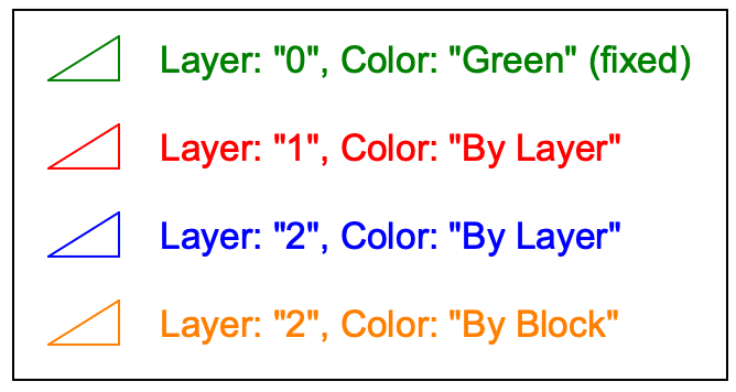 Since layer "1" has its color set to "red", these entities are displayed in red. The layer the block reference is placed on is irrelevant. - The third triangle and text reside on layer "2" which is blue.